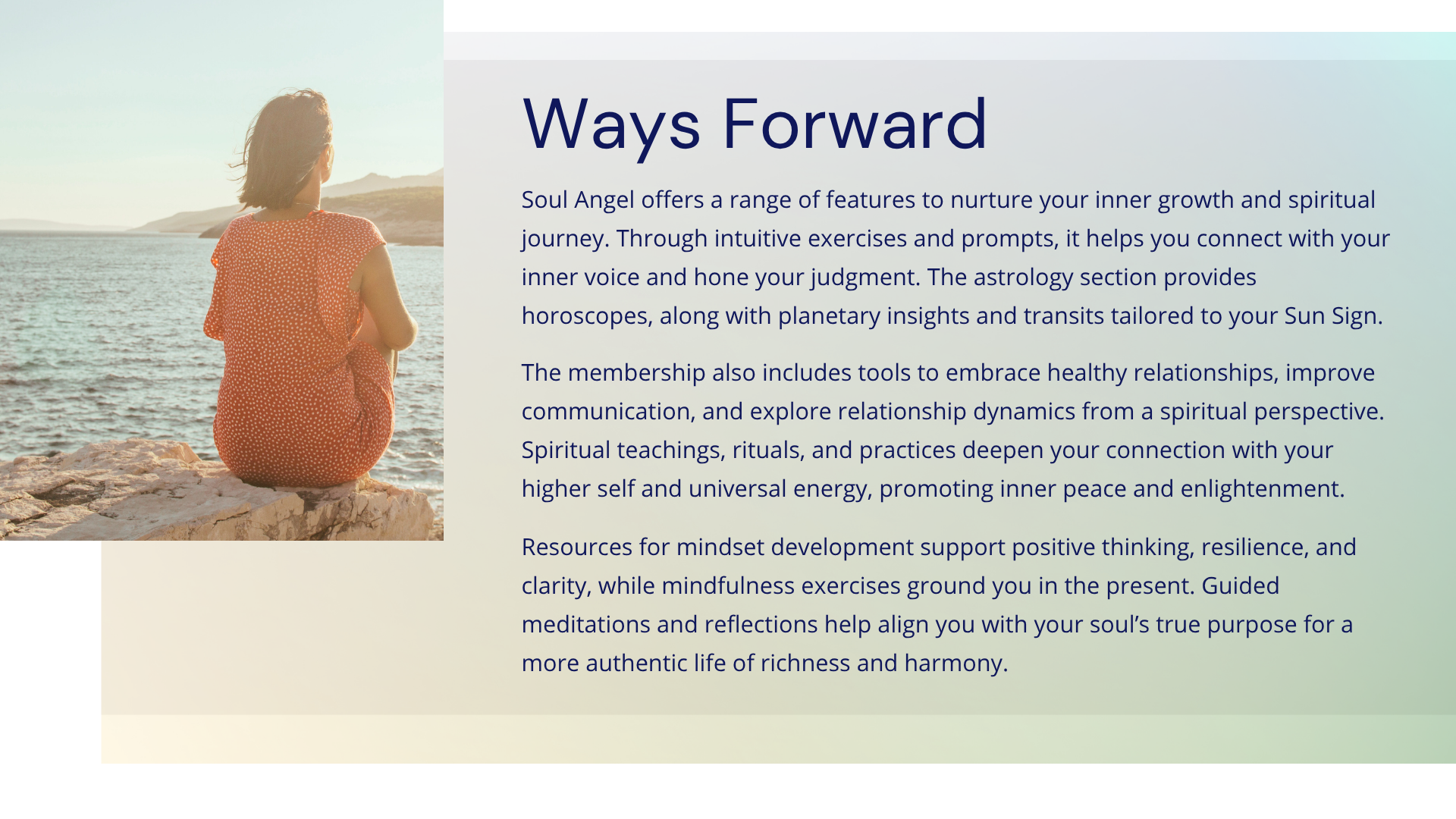 Soul Angel Journey Discover Your Inner Path Where Your Spirit Awakens and Your True Path Unfolds. Your Soul Journey guides you to embark on a transformative journey towards self-discovery and spiritual growth where you tap into your intuition and unleash your inner wisdom through mindfulness practices, astrology insights, and nurturing relationship tools as you unlock your true self and embrace a life of authenticity, richness and harmony.